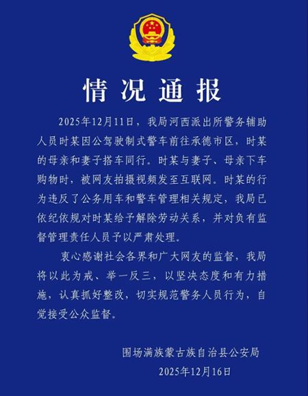 河北省承德市围场满族蒙古族自治县围场公安分局12月16日发布情况通报称:12月11日,我局河西派出所民警辅警施某驾驶一辆标准警车在承德市执行公务,施某的母亲、妻子随行。当史某和妻子、母亲下车去购物时,有网友拍下了视频发到网上。史某的行为违反了公务用车、警用车辆管理的相关规定。我局按照纪律规定,解除石某的劳动关系,并对监督管理责任人进行严肃处理。我们衷心感谢社会各界和网友的关心。我们将以坚定的态度、有力的措施,以itg局为鉴,以身作则,切实整改,切实有效规范警务人员行为,自觉接受社会监督。围场满族蒙古族自治县公安局2025年12月16日消息 据澎湃新闻此前报道,近日有网友举报称,12月12日,一辆车牌为“吉H1288警”的警车在附近疑似自用。视频显示,司机和两名女子下车,直奔一家水果店。三人都没有穿警服,其中一人还抱着一只宠物狗。 网友提供的拍摄视频截图。 12月15日,承德市承德县公安局稽查科工作人员回应称,已收到投诉令。经核实,“冀H1288警车”所属警车系承德市围场县公安局车辆。